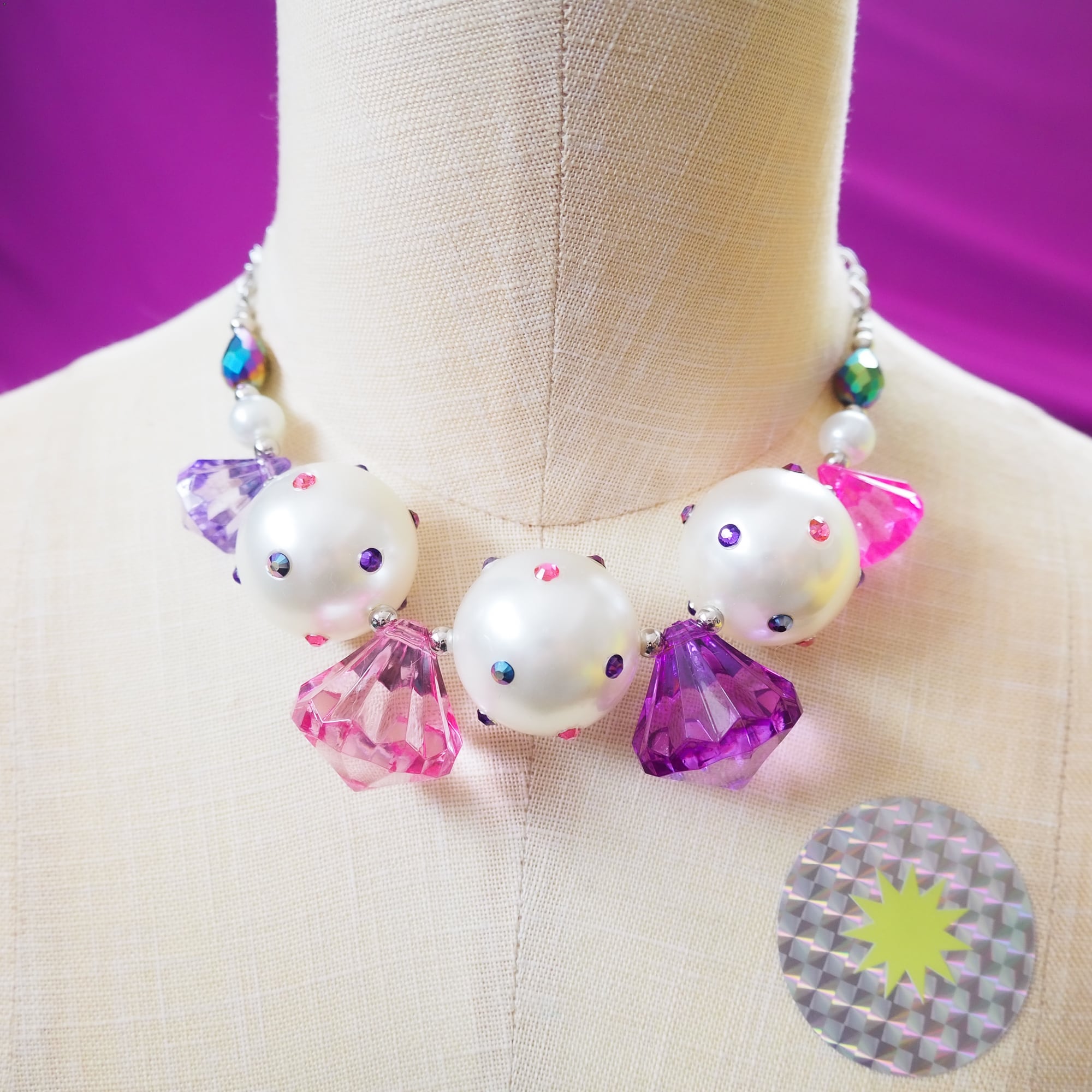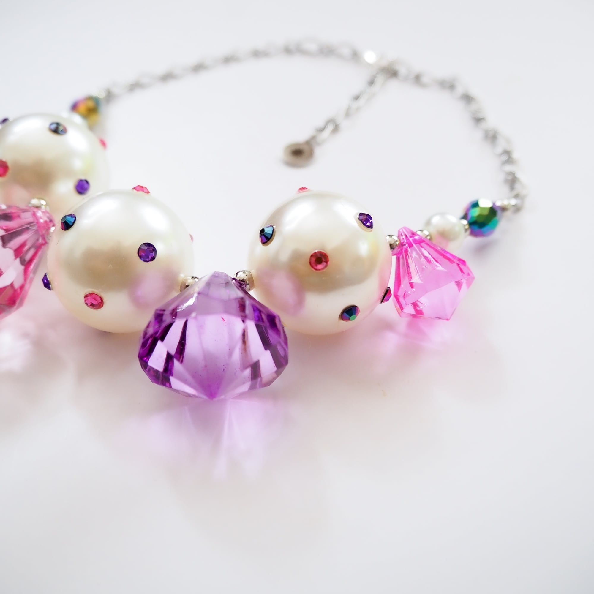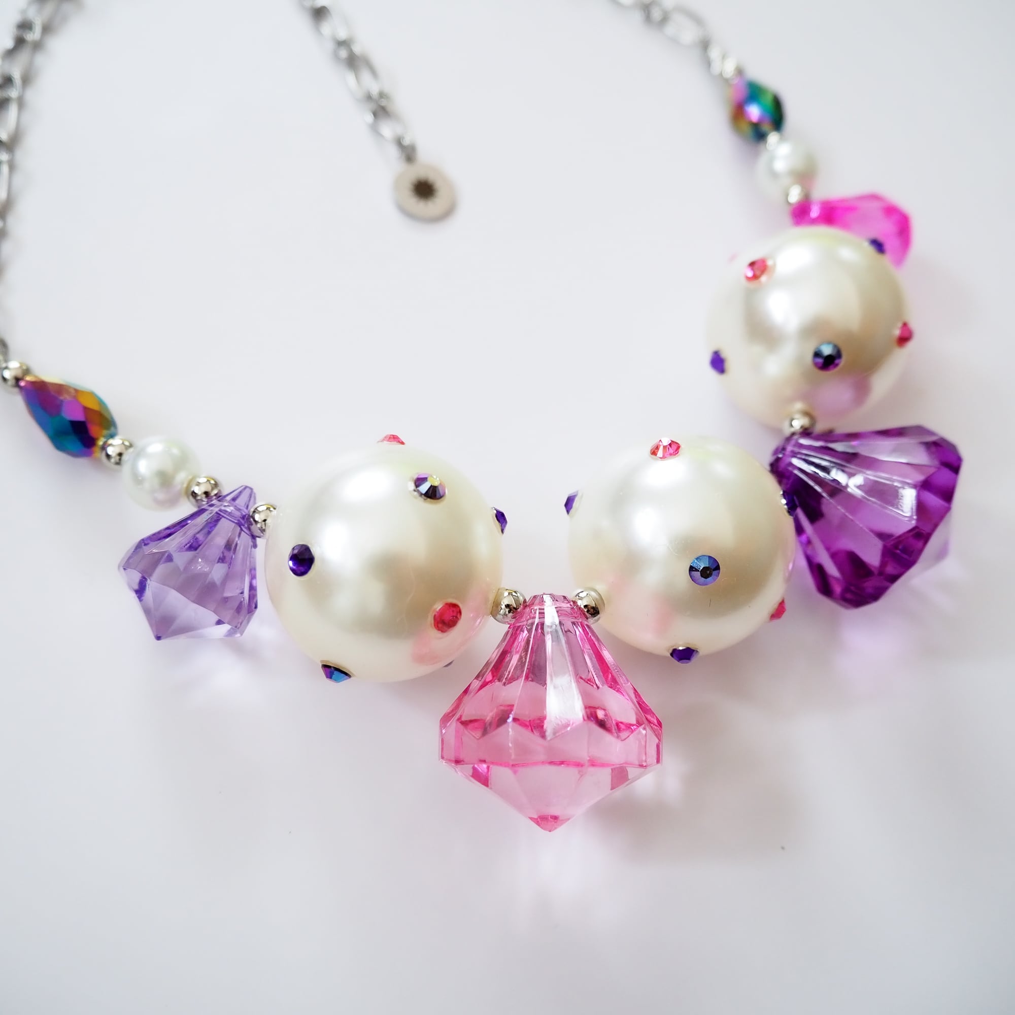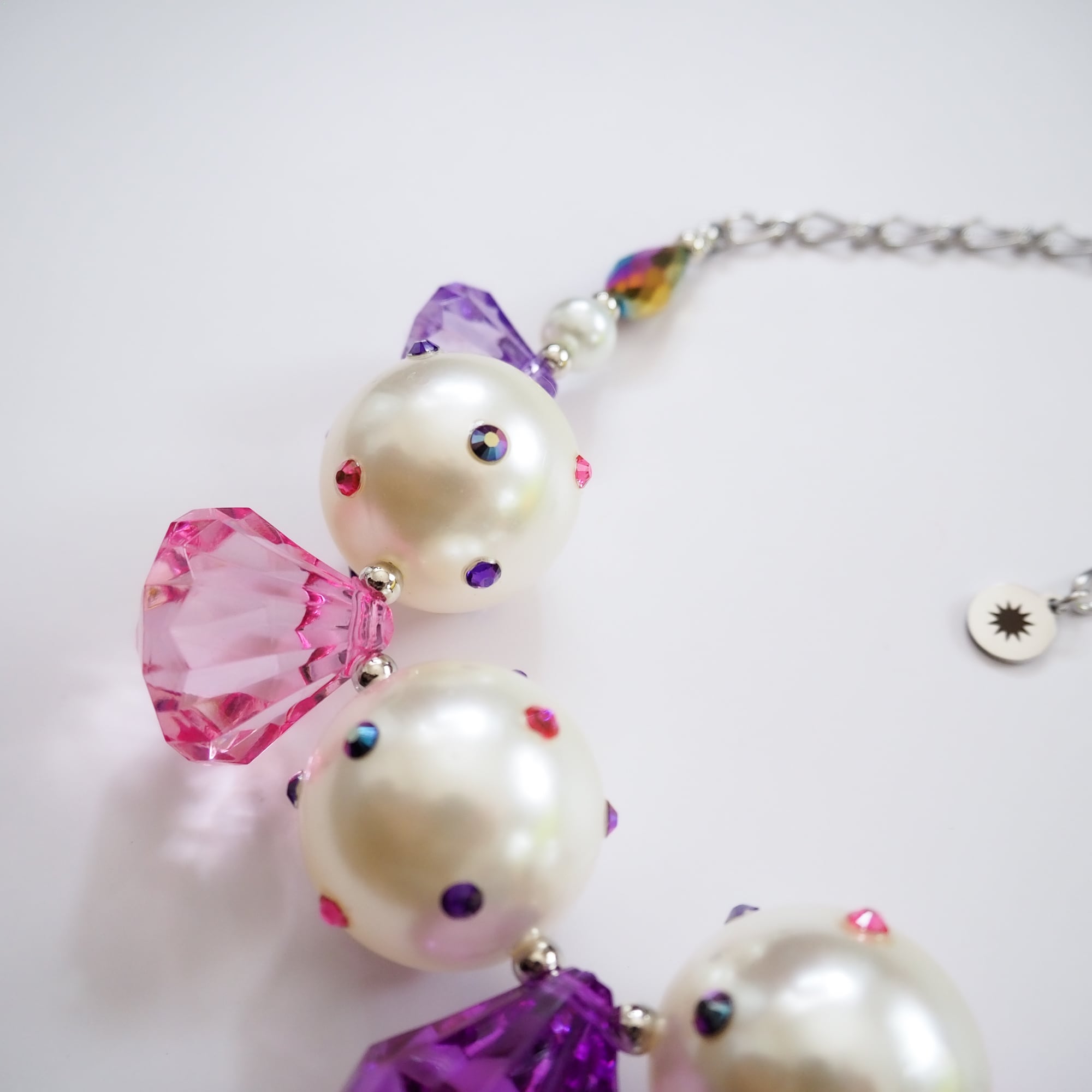使用しているパール加工アクリルビーズは、色味や表面の表情に個体差のあるビーズを活かし、ラインストーンを一点ずつ貼り付けて仕上げたアップサイクルパーツです。